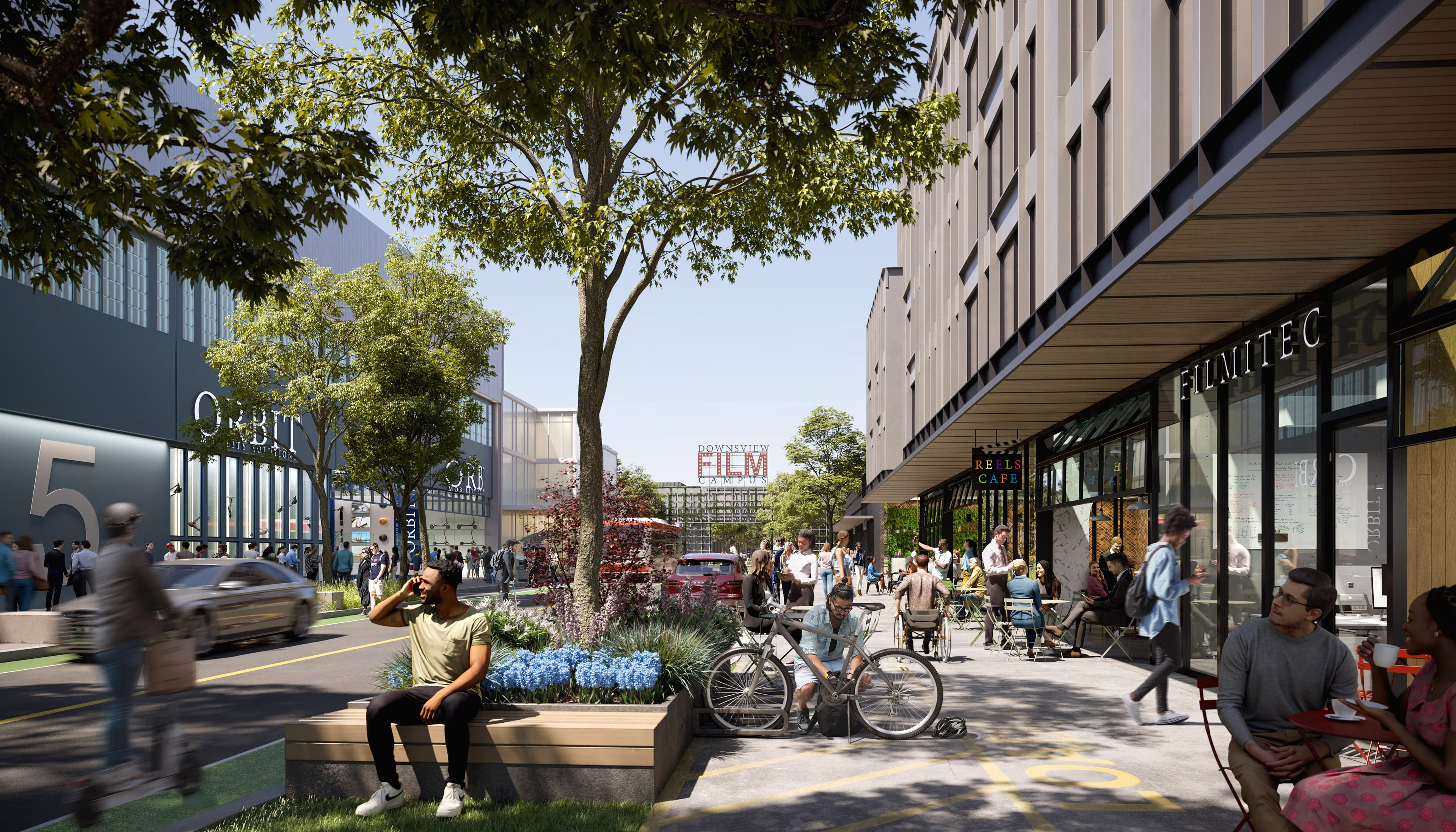 The Hangar District features a well-connected, fine-grained street network that prioritizes walking, cycling, and transit, while actively supporting a shift away from private vehicle use.