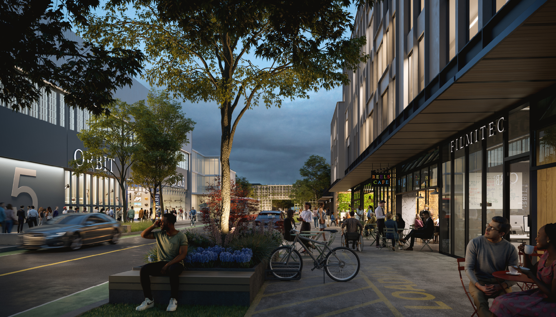 The Hangar District features a well-connected, fine-grained street network that prioritizes walking, cycling, and transit, while actively supporting a shift away from private vehicle use.