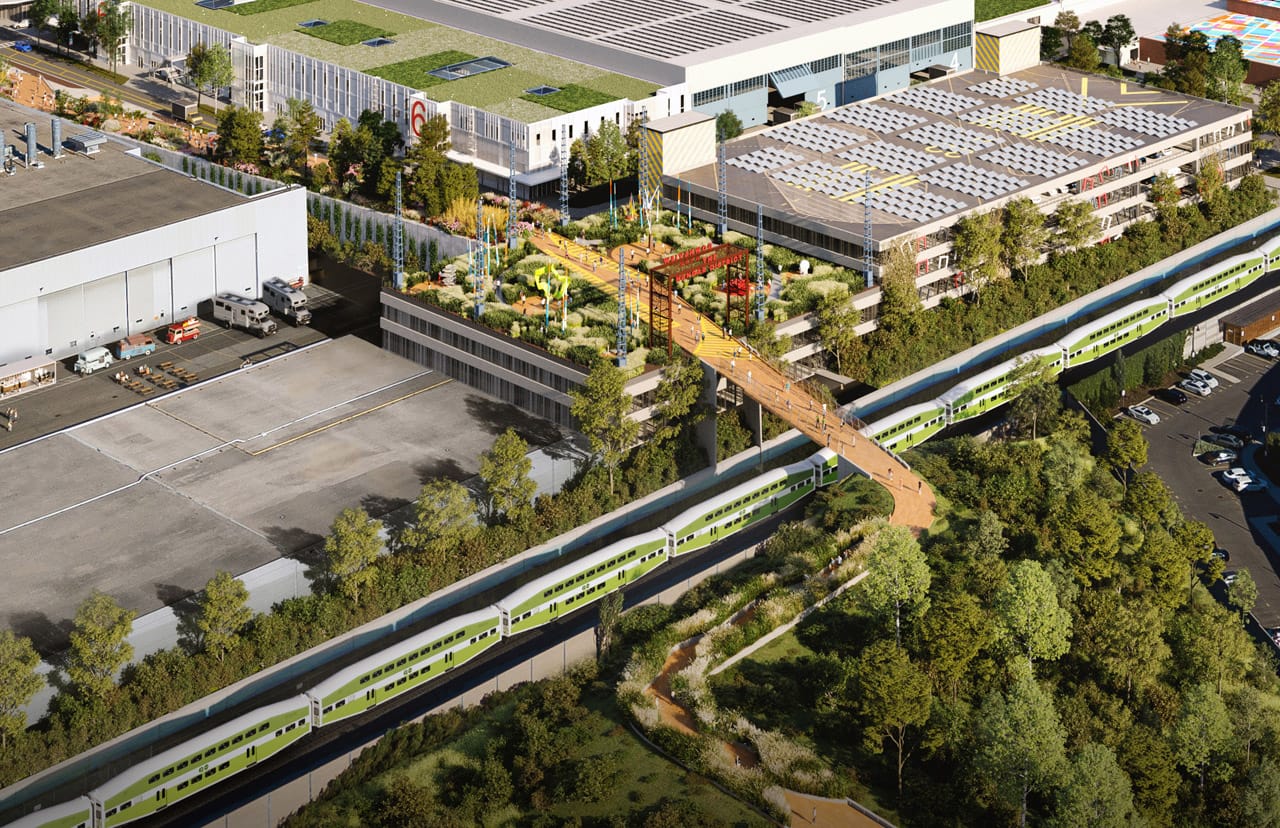 A new pedestrian and cycling bridge over the rail corridor to connect The Hangar District to Downsview Park. The Downsview Park Bridge features a green, densely vegetated multi-use path for people to enjoy and take in the scenic views, while connecting with nature and enjoying periodic programming.