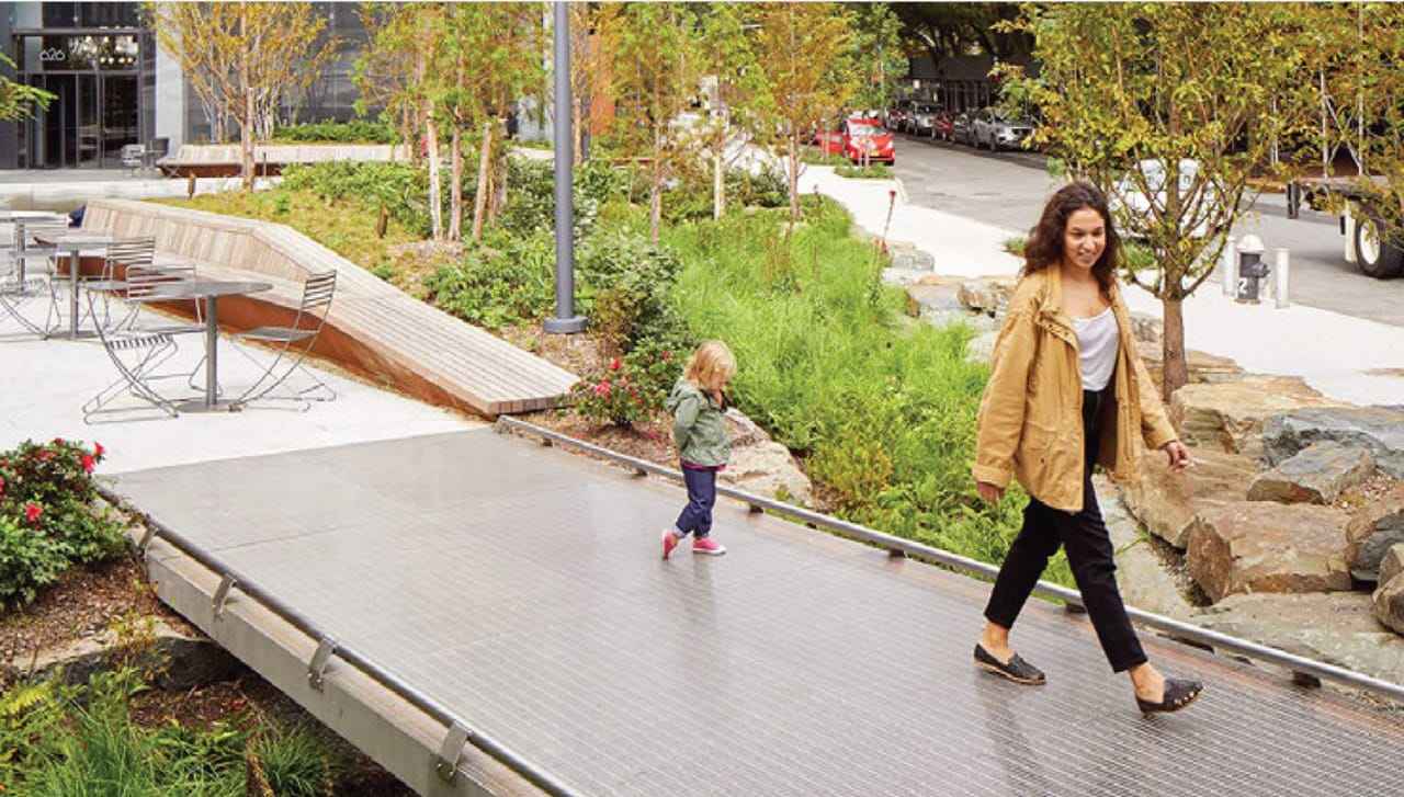 The Hangar District will feature an innovative decentralized approach to managing stormwater. This strategy involves using green infrastructure such as bioswales and soil cells within parks, open spaces and streets to retain stormwater onsite, mitigate or reduce future flooding risks, and enhance the public realm.